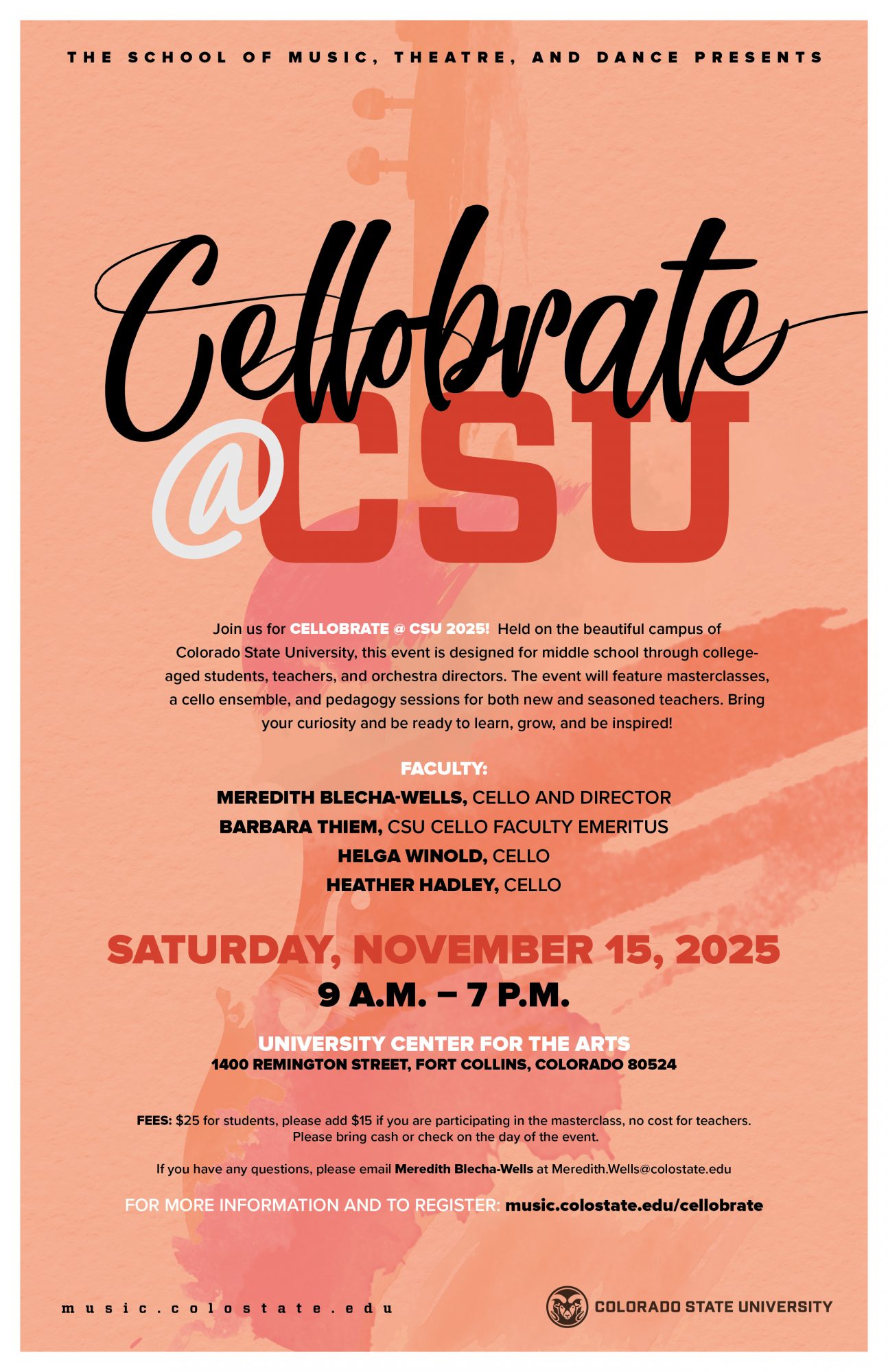 Join us for Cellobrate @ CSU 2025! Held on the beautiful campus of Colorado State University, this event is designed for middle school through college-aged students, teachers, and orchestra directors. The event will feature masterclasses, a cello ensemble, and pedagogy sessions for both new and seasoned teachers. Bring your curiosity and be ready to learn, grow, and be inspired!