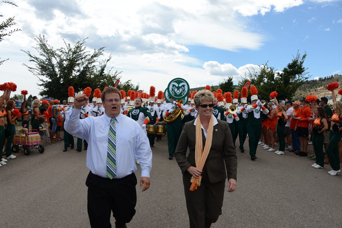 Directors Richard Frey and Rebecca Philips lead the marching band onto the field at a recent game_web June 6, 2016 1199 × 800 Marching forward: Band members thrive thanks to donor support CSU Marching Band Directors Richard Frey, Rebecca Phillips 2016